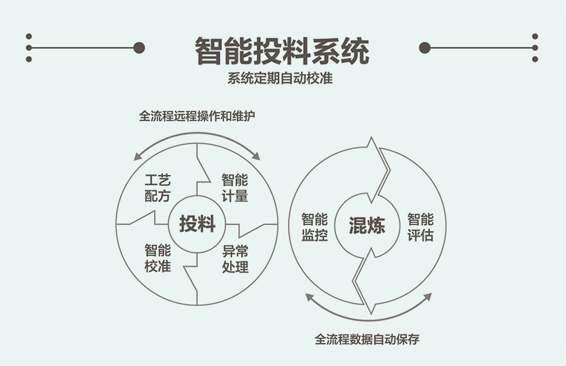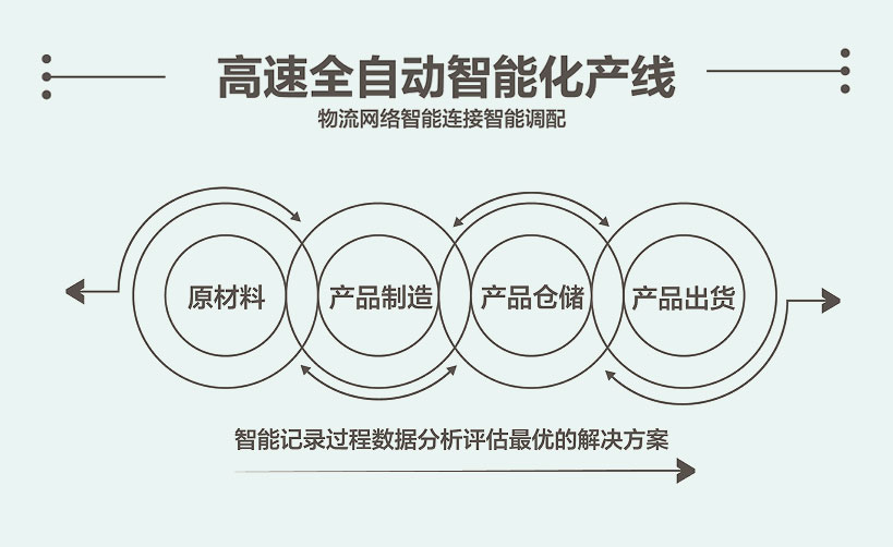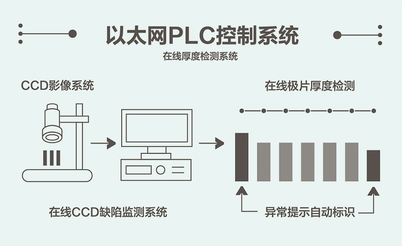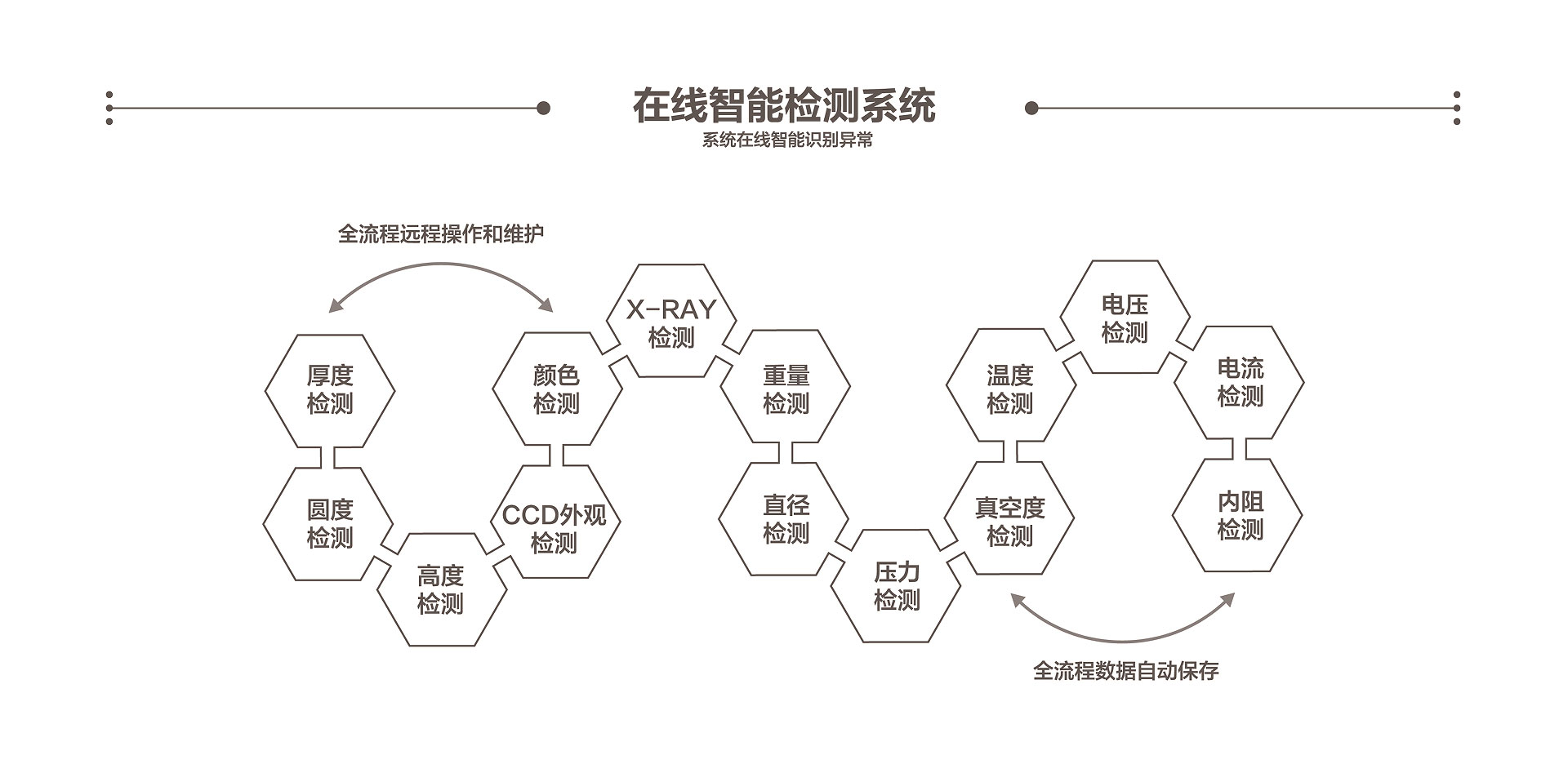 各工序设备间物流网络智能连接,系统智能调配,每道工序均配备了在线智能检测系统(包含厚度,圆度,高度,状态,CCD外观,颜色,x-ray,重量,直径,压力,真空度,温度,电压,电流,内阻等)记录和存储过程数据,系统在线智能识别异常,自动处理异常。在线产品仓储利用智能立库系统,最大的提高车间容积率,提高生产力和防止操作错误并与生产计算机系统有效连接,信息共享,智能调配。